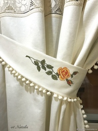Полотно разрезаем пополам и подшиваем со всех сторон. Пожалуй, это вся основная работа. Остается только пришить крепление к карнизу. Люверсы или кольца хорошо подходят к съемному карнизу, стержень которого пропускают через них, образуя волны. Петли более универсальны и придают свою «изюминку» шторам, их можно сделать пришивными, в этом случае карниз так же должен быть съемным. Либо на завязках, эти петли могут фиксироваться с помощью изящных бантиков, придавая интерьеру свою неповторимость и оригинальность. Фиксаторы располагают на расстоянии не более 40см, иначе штора начнет провисать, образовывая глубокие впадины.