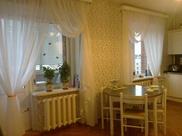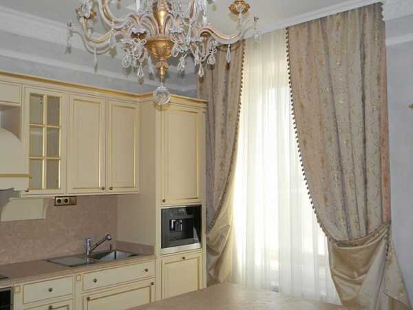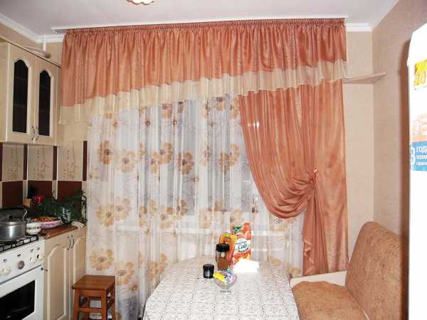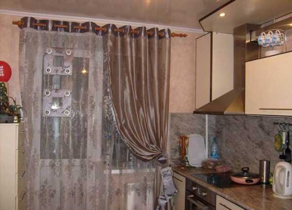 Романтики и ценители винтажного искусства могут поэкспериментировать со шторами из ткани с подхватами. На кухонном окне они будут смотреться гармонично в сочетании с коротким тюлем. Конструкция удобна и практична, позволяет свободно пользоваться выходом на балкон.