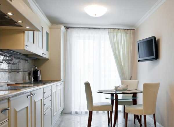 - Обилие декора, ламбрекены, оборки, драпировки для кухни с балконом неуместно.