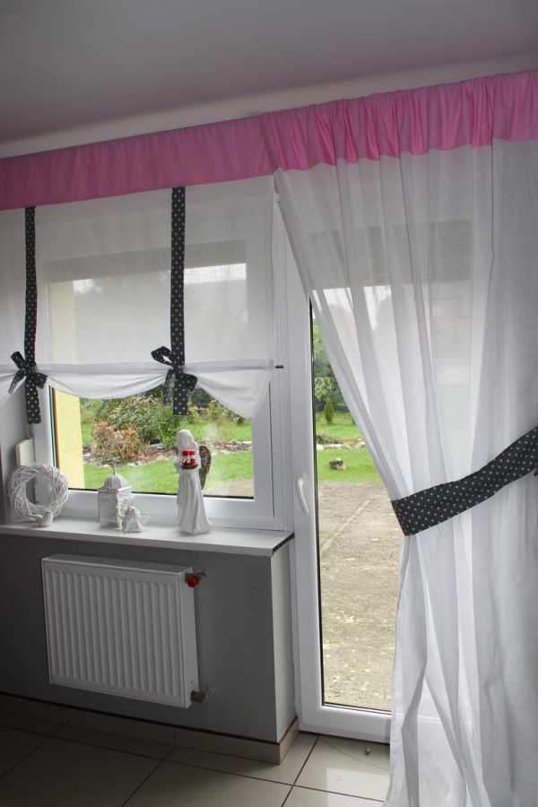 Совет. Чтобы скрасить строгость рулонных штор, проем декорируется прозрачными занавесками длиной до подоконника. Они могут быть разного покроя: по диагонали, в виде арки, со свисающими углами. Крой занавесок нужно продумать так, чтобы они не мешали открывать дверь и держать ее в открытом положении.