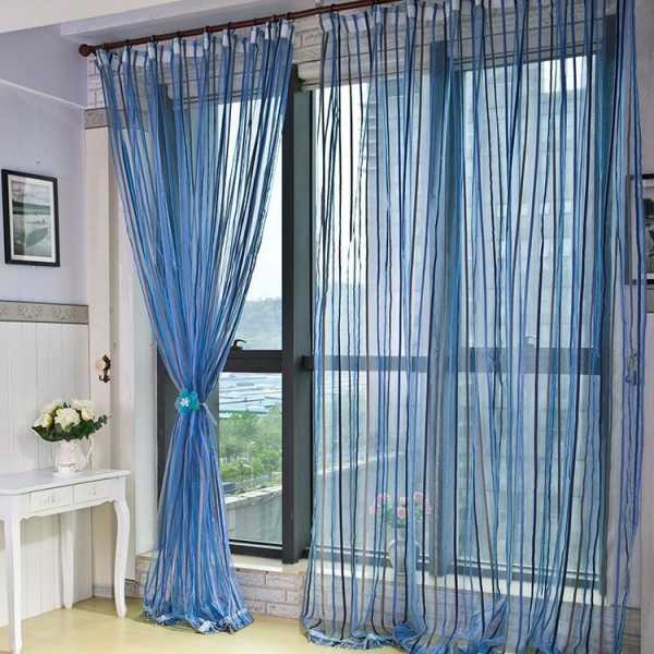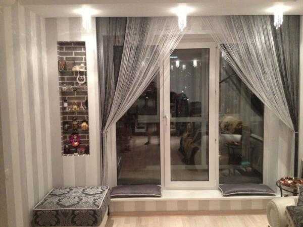 Анализируя варианты штор, подходящих для оформления балконного блока, стоит отметить новинку — нитяные. Главное их преимущество — легкость. Изделия практически ничего не весят, простые в уходе и практичны в эксплуатации. Для оформления оконного блока с балконом шторы подходят как нельзя лучше, так как оставляют свободным доступ на балкон.