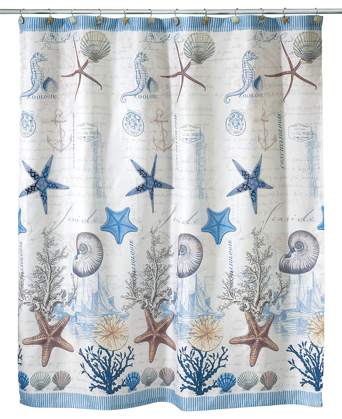 Перейдем к самой очевидной и распространенной по морской отделки комнате — к ванной. Благодаря распространенности рынок изобилует ванными шторами с якорями, ракушками, камнями, пляжами и рыбами. Тут нам повезло, ведь тогда нам предоставляется широкий выбор из тысяч предложенных вариантов.