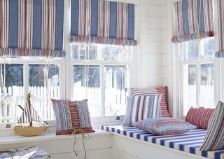 Для занавесок в морском стиле лучше предпочесть конструкцию в виде римских или японских штор, фестоны или жалюзи.