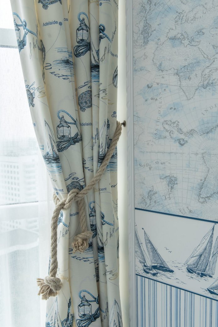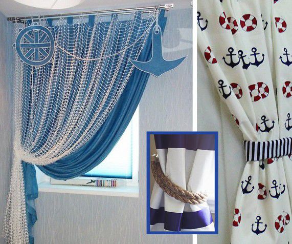 При оформлении таких портьер используют подхваты, стилизованные под морские канаты, деревянные карнизы с кольцами, заколки для штор в виде корабельных штурвалов, морских коньков и т.д.