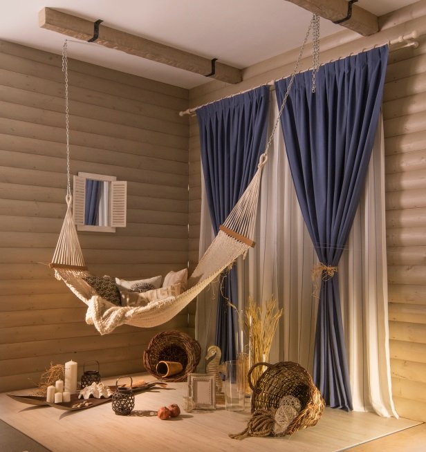 Шторы — главная часть спальни, ведь они защищают комнату от света, который так любит будить нас по утрам. Необычным и стильным решением могут стать шторы-рыболовные снасти. Их можно прицепить к карнизу с помощью железных колец, либо же просто небрежно накинуть на крепление.