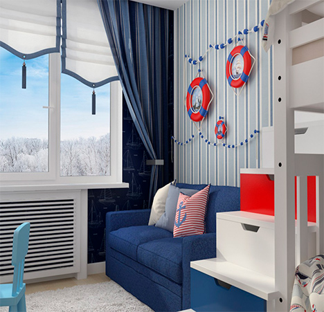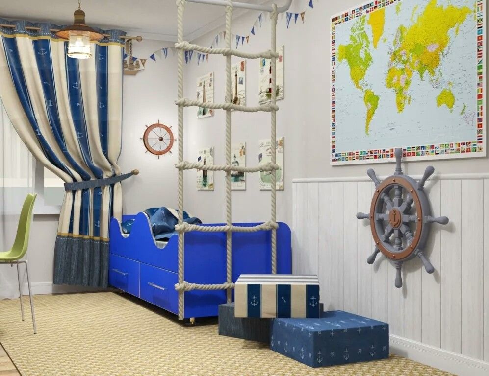 Комнату украшали аксессуарами – игрушечным корабельным штурвалом, веревочной лестницей, подзорной трубой. Даже окна иногда делали круглыми, в виде иллюминаторов.