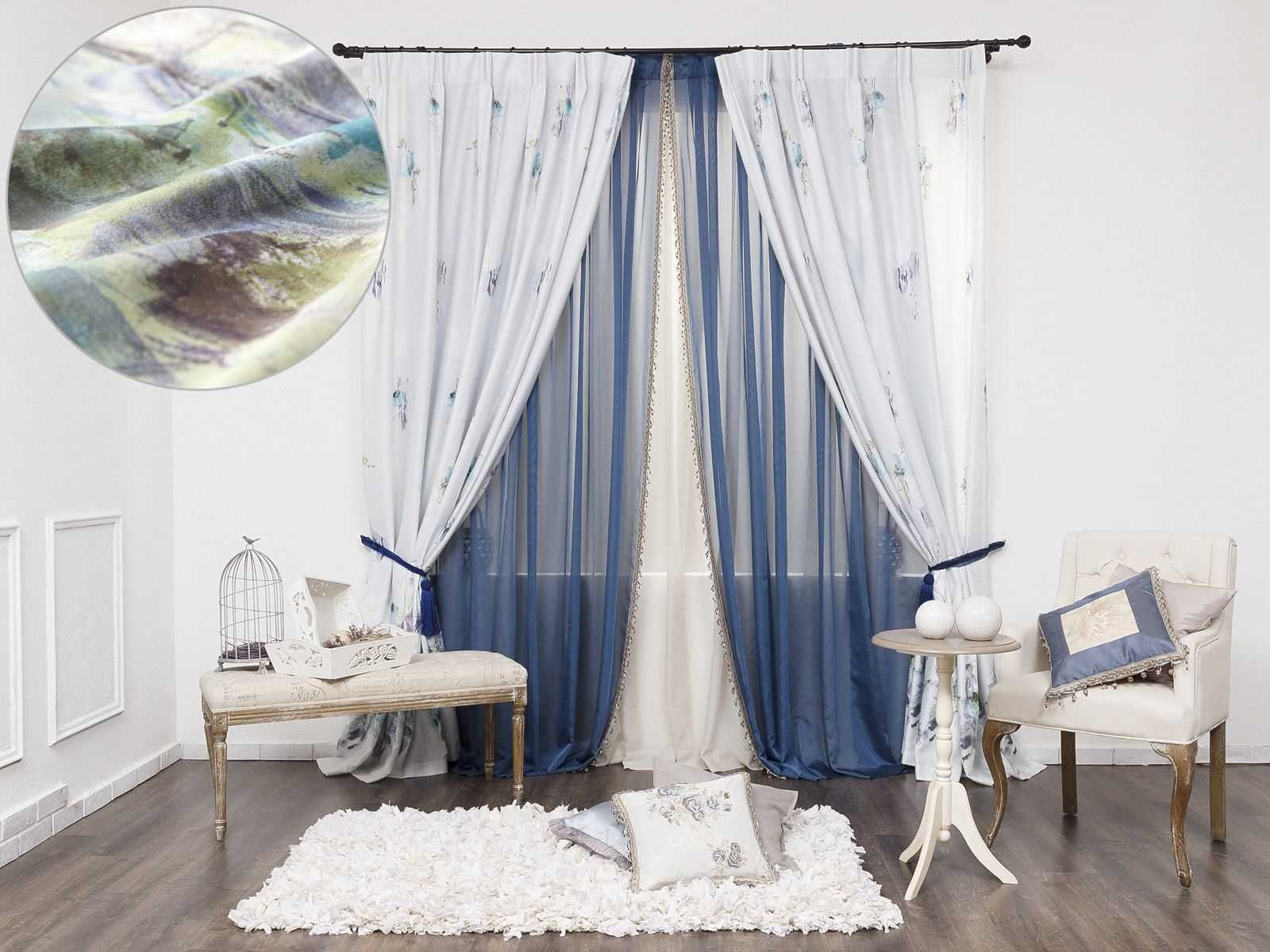 Ткань — самая важная часть штор, обратите на нее внимание. Нет ничего важнее ткани, так как шторы на 100% состоят из нее. Она может быть сделана из природных материалов, либо из искусственно синтезированных. Цвета должны быть в соответствии со стилем — белые и синие цвета и оттенки.