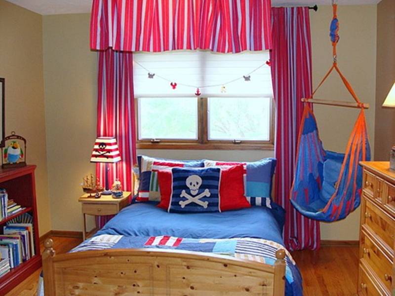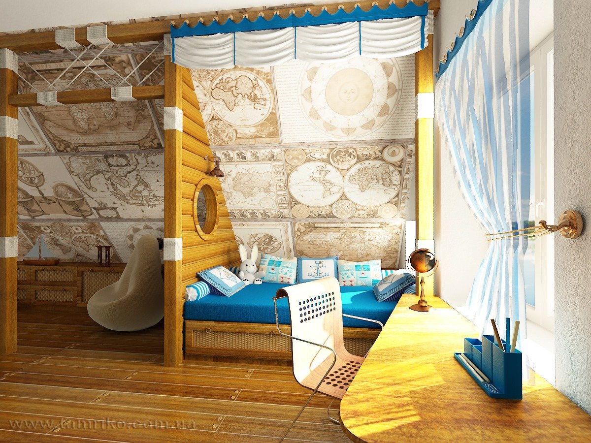 В такой комнате можно не боятся использовать фантазию на полную. С помощью небольших манипуляций можно легко превратить комнату вашего сына или дочери в палубу корабля, каюту или бунгало на пустынном острове.