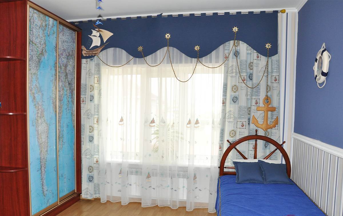 Выполнить пошив штор в корабельной или морской тематике несложно, главное – определиться с их видом и правильно вписать в дизайн помещения. Создание штор и деталей к ним самостоятельно можно выполнять вместе с детьми.