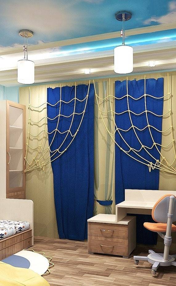 Все мы помним, как в детстве играли в пиратов или представляли себя капитаном корабля дальнего плаванья. При упоминании морской стилистики сразу приходит на ум детская комната. Шторами в морском стиле для мальчика хорошо послужат «псевдорыболовные» сети, описанные выше.