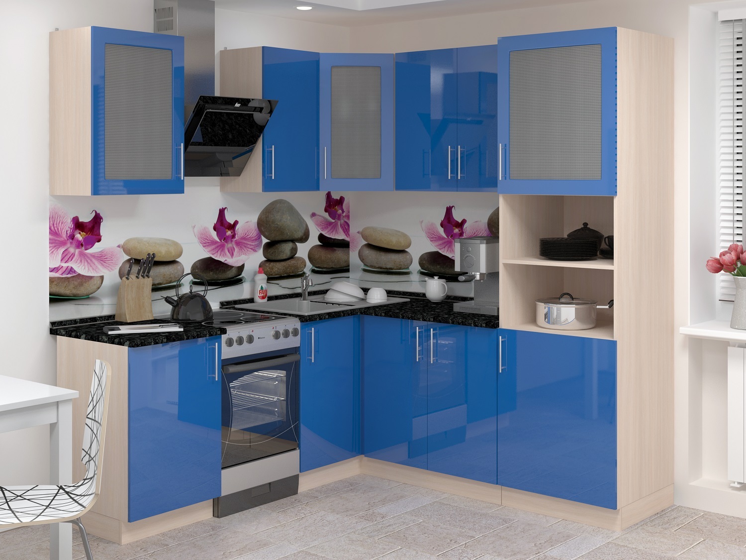 На фото гарнитур углового типа с лакированной поверхностью. Столешница выполнена из натурального камня с синими отливами.