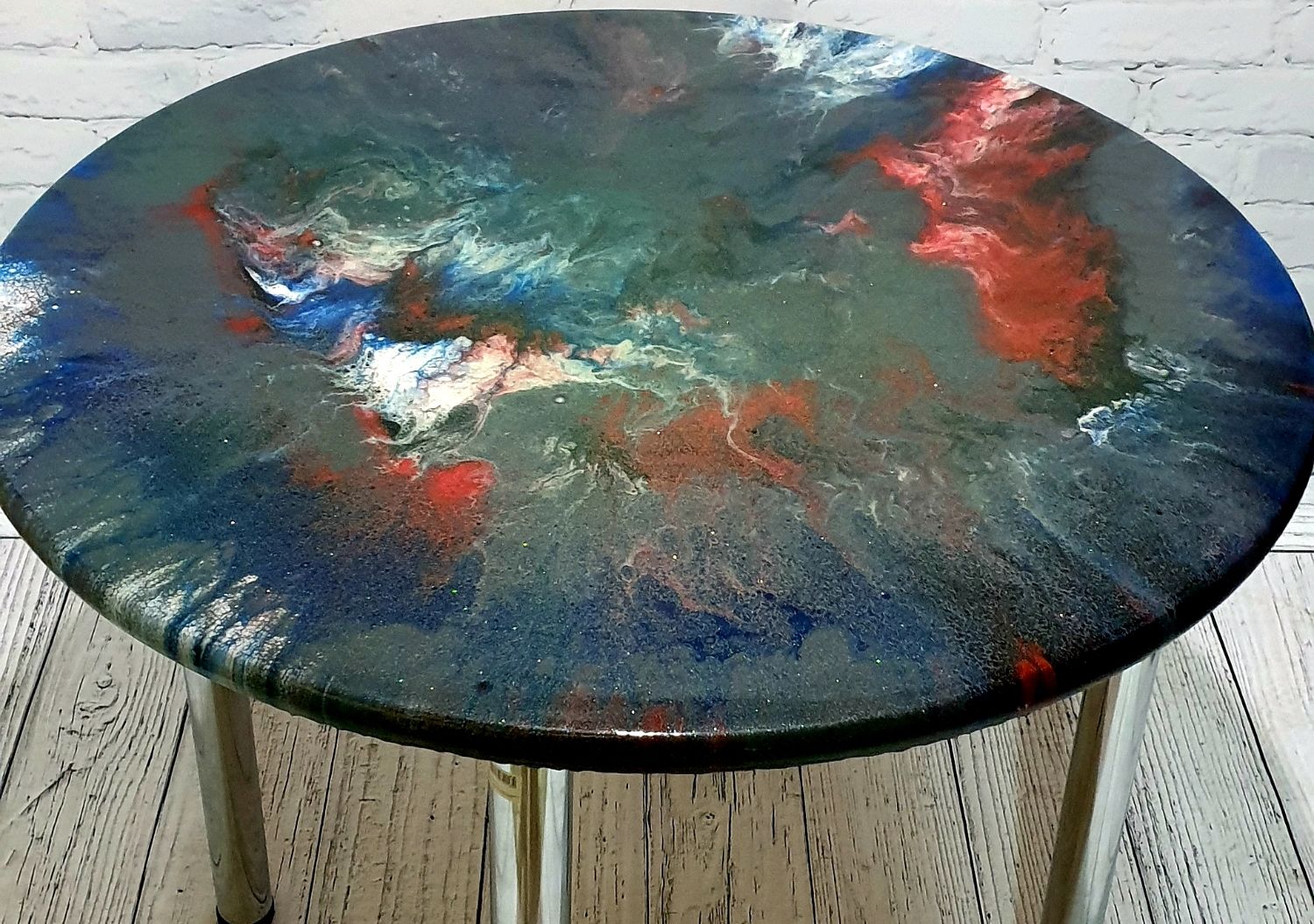 Если делать стол из эпоксидной смолы собираетесь впервые и с этим материалом дел ранее не имели, лучше выберите те, которые наливаются тонким слоем. С ними проще добиться отсутствия пузырьков. Хотя, возможно, вам нравится эффект «застывшей газировки». Если желаете смолу подкрасить, надо покупать специальные красители. При послойной заливке краситель разводят в одном из компонентов до добавления отвердителя. Так цвет получится однородным.