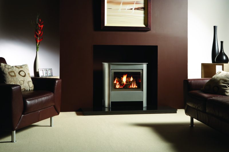 Интересно смотрится такой фон у камина с мраморной облицовкой на боковой стене относительно мягкого уголка в гостиной.