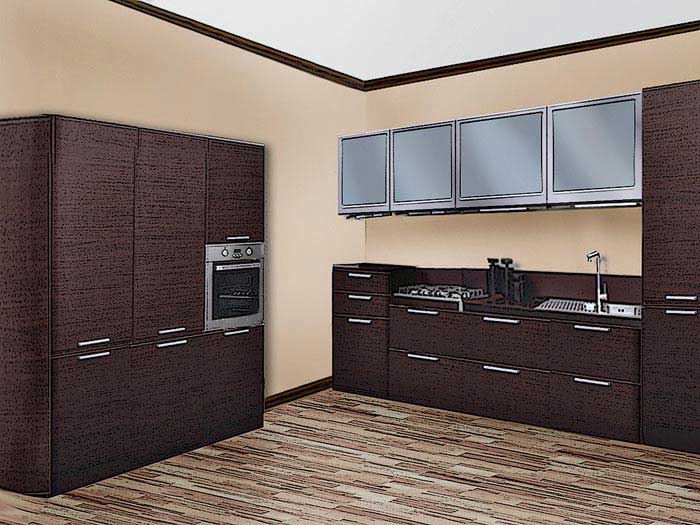 Варианты интересных проектов обустройства кухни с использованием одного из оттенков массы венге.