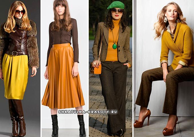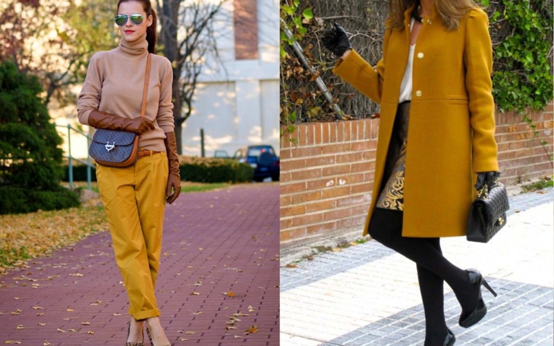 Аксессуары и обувь для такого наряда желательно подбирать в коричневых оттенках. Универсальным вариантом является комбинация горчичной юбки с классической белой блузкой. С таким ансамблем стилисты советуют носить высокие замшевые сапоги бежевого цвета. Сумка может быть в тон обуви. Стильно также выглядит бежевый костюм или платье с горчичным пиджаком и такими же сумкой и сапогами.