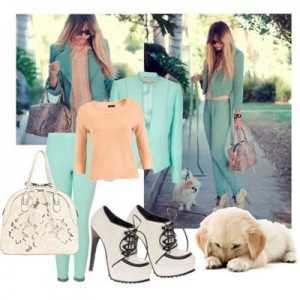 - Персиковый с мятным. Свежий мятный оттенок весьма удачно гармонирует с персиковым, особенно актуально такое сочетание в летний период на морском побережье. Рекомендуется комбинировать верх и низ разных цветов либо разбавлять один оттенок другим с помощью обуви или аксессуаров.