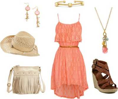 Легкое мандариновое платье, можно дополнить персиковыми босоножками или туфлями. Сумочку можно взять небольшого размера белого тона. Украшения подойдут из белого жемчуга.