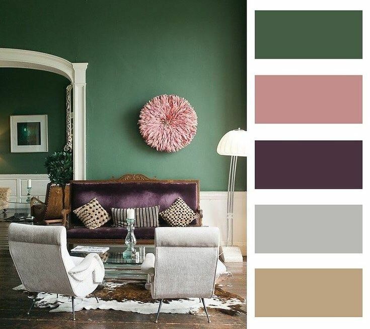 Пурпурный и баклажановый идеально оттеняет серо-зеленый. Дополнить сочетание можно темно-синим или черным.