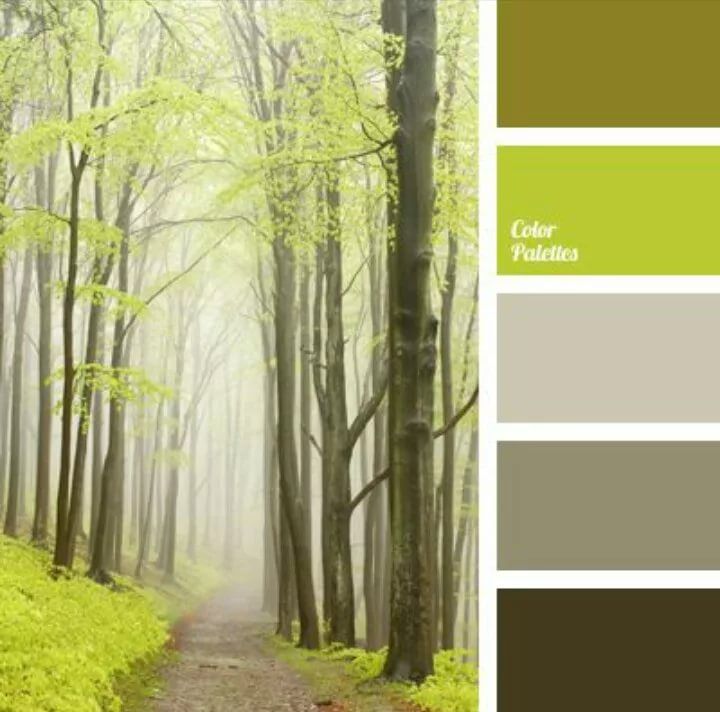 Глубокая, умиротворяющая и расслабляющая гамма зеленых оттенков леса всегда будет иметь в себе серо-зеленые тона. Такая палитра включает в себя светлые бледно-зеленые краски, средне-зеленый (лиственный), хвойный, серо-зеленый, золотисто-коричневый и глубокую черную тень. Широкая гамма хвойно-зеленых оттенков усиливают глубину и объем фона.