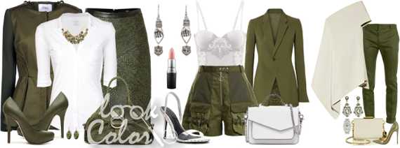 Белый с оливковым сочетаются элегантно. Чисто белые тона увеличивают контраст, придают свежести, тогда как более сложные оттенки белого углубляют сочетание, раскрывая внутренние силы оттенков. Разнообразить сочетание могут как серебряный, так и золотой, а также освежит ее коричневый или бежевый.