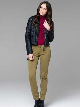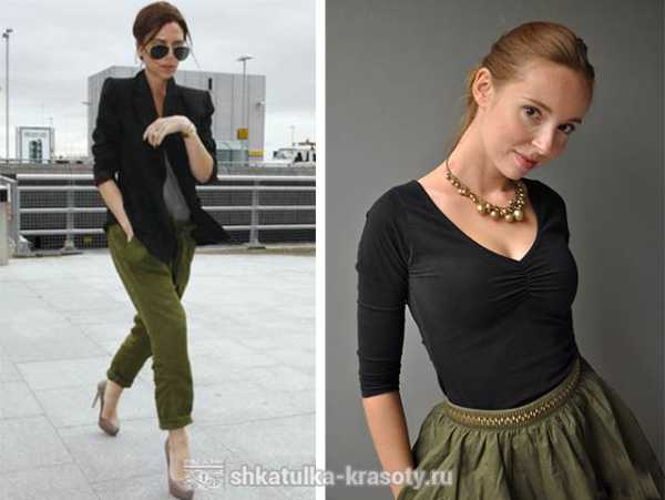Популярный комплект – чёрные брюки, прямые или немного расклешённые от бедра, и оливковая облегающая водолазка. Наряд подойдёт девушкам с тёплым, золотистым цветом кожи и тёмными или рыжими волосами. В завершение образа подберите обувь чёрного или тёмно-серого тона.