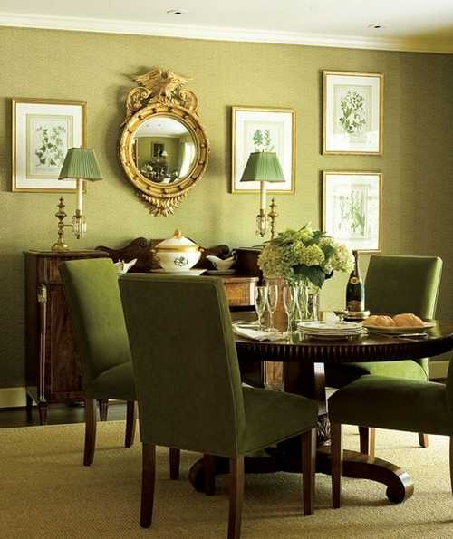 Гостиная, оформленная с преобладанием оливкового цвета и не имеющая ярких «вспышек», как правило, выполнена в классическом стиле. Для него не характерна вычурная, яркая отделка и цветовой контраст, поэтому оливковый цвет в интерьере гостиной не разбавляется противоположными оттенками, а так и оставляется в приглушенной гамме.