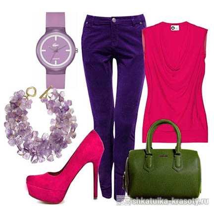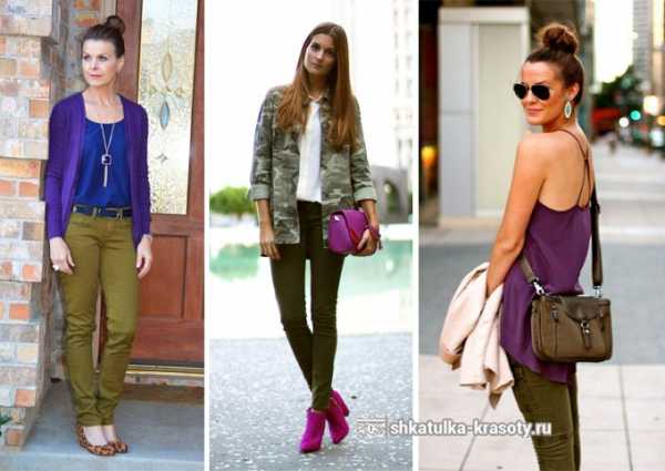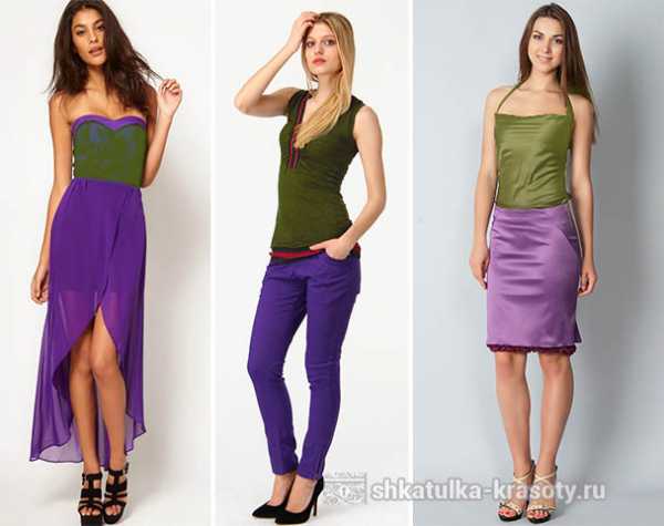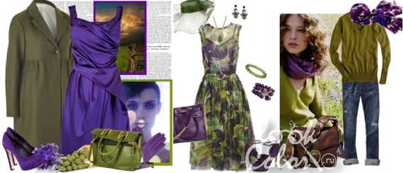 Правильно сочетать фиолетовый цвет одежды с оливковым сложно, но если удастся, получится элегантный образ с ноткой таинственности. Основное правило — комбинировать тёмно-оливковый тон с глубоким фиолетовым оттенком, а светло-оливковый с сиреневым цветом. Во втором случае получится нежный и свежий облик, напоминающий цветущий куст ароматной сирени. Сочетание рекомендовано девушкам с мягкой, неконтрастной внешностью.