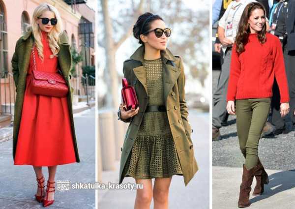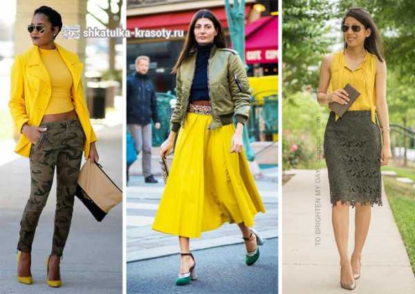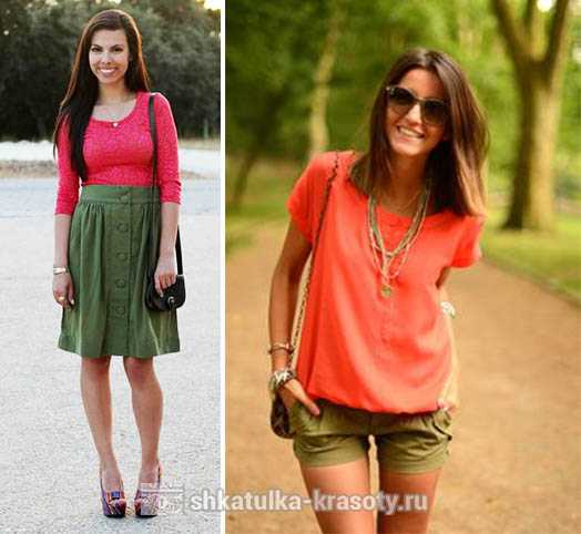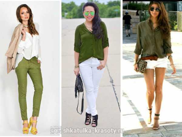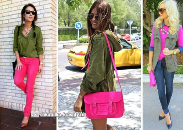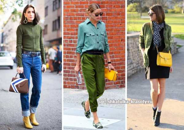 Оливковый цвет можно объединять в одном комплекте как с нейтральными оттенками, так и с яркими, и он везде будет хорошо смотреться.