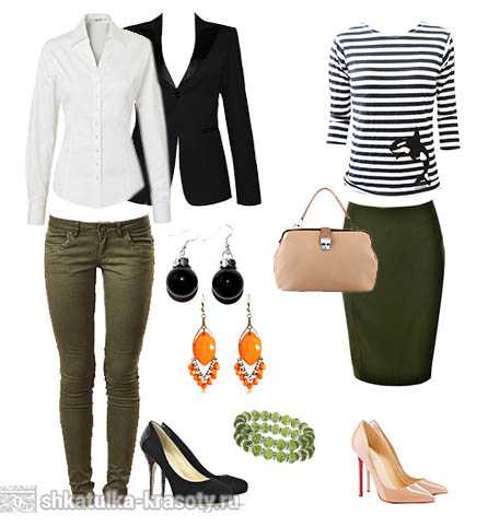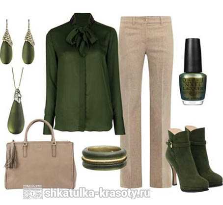Цвет оливы выглядит сдержанно и неброско, поэтому подходит для офисного гардероба. Классический вариант – оливковый и белый. Сочетание освежит образ, но не сделает слишком ярким и кричащим. Комбинируйте тёмные брюки и юбки с белыми блузами или рубашками. Из обуви предпочтительны лодочки бежевого, серого и чёрного тона.