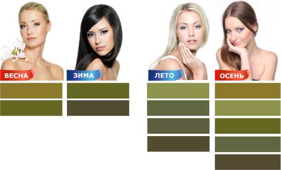 Так относительно чистые, насыщенные оттенки, такие как золотисто-оливковый и ярко-оливковый подойдут для «весны». Для «зимы» будут доступны только яркие и темные тона при условии участия в композиции более чистых и ярких цветов, например, красного или оранжевого. «Лето» может пользоваться светло-оливковым, оливковым хаки, серо-оливковым, темно-оливковым. Для «осени» доступны практически все оттенки этого цвета.