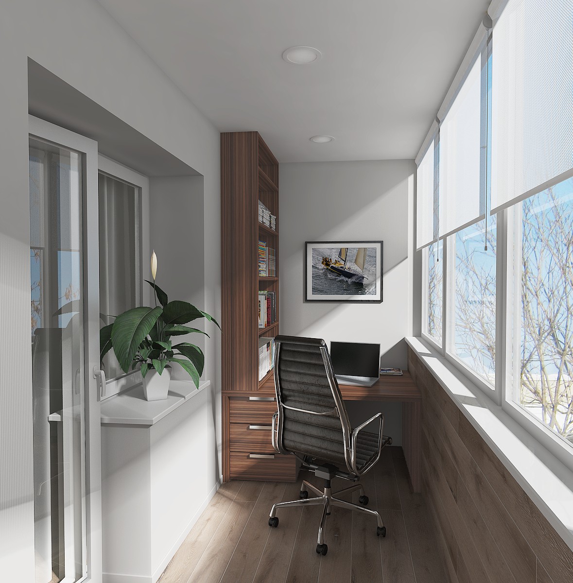 Рабочая комната на балконе вполне подойдет для комфортного труда одного человека. Важную роль здесь играет достаточное количество естественного света, что немаловажно при сидячей работе. При этом бывшее окно переделано в элегантный стеллаж для книг.