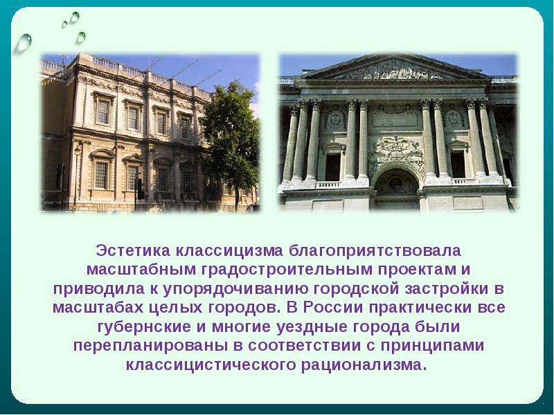 Эстетика классицизма была благоприятна для создания масштабных проектов в рамках целых городов. В России многие города были перепланированы в соответствии с принципами классицистического рационализма.
