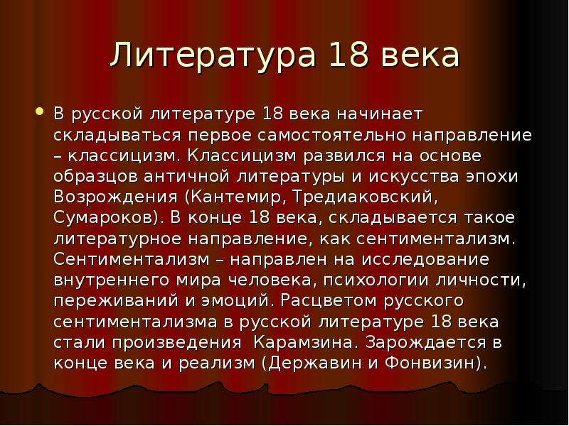 Представители классицизма в русской литературе — А.Д. Кантемир, М.В. Ломоносов, А.П. Сумароков, Д.И. Фонвизин.