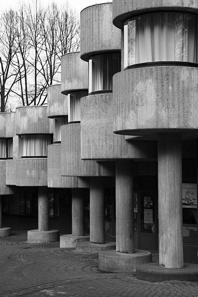 Это отдельная большая тема: те же люди, что построили Дом пионеров на Воробьевых, — Полянский, Новиков и другие — получили задание на разработку советской Силиконовой долины. Зеленоград должен был стать тем же, что сегодня делают в Сколково — только к 1980-м годам. Сначала была задумка развивать текстильную промышленность, но потом Хрущев переориентировал город на электронику. Не все из запланированного было реализовано, но самое классное здание — наверное, длиннющий «Дом-флейта» (1969). Это важный элемент для всего города. В Зеленограде есть озеро, с одной стороны новые корпуса заводов, среди хайвеев институт, а с другой стороны — жилье, парк, ДК, мэрия, высотная гостиница. Флейта стоит как фон гостиницы, мэрии и ДК возле водоема. Вместе выходит очень красивая композиция — все по заветам Корбюзье и Гинзбурга с Николаевым: дом на ножках, плоские кровли, ленты-окна.