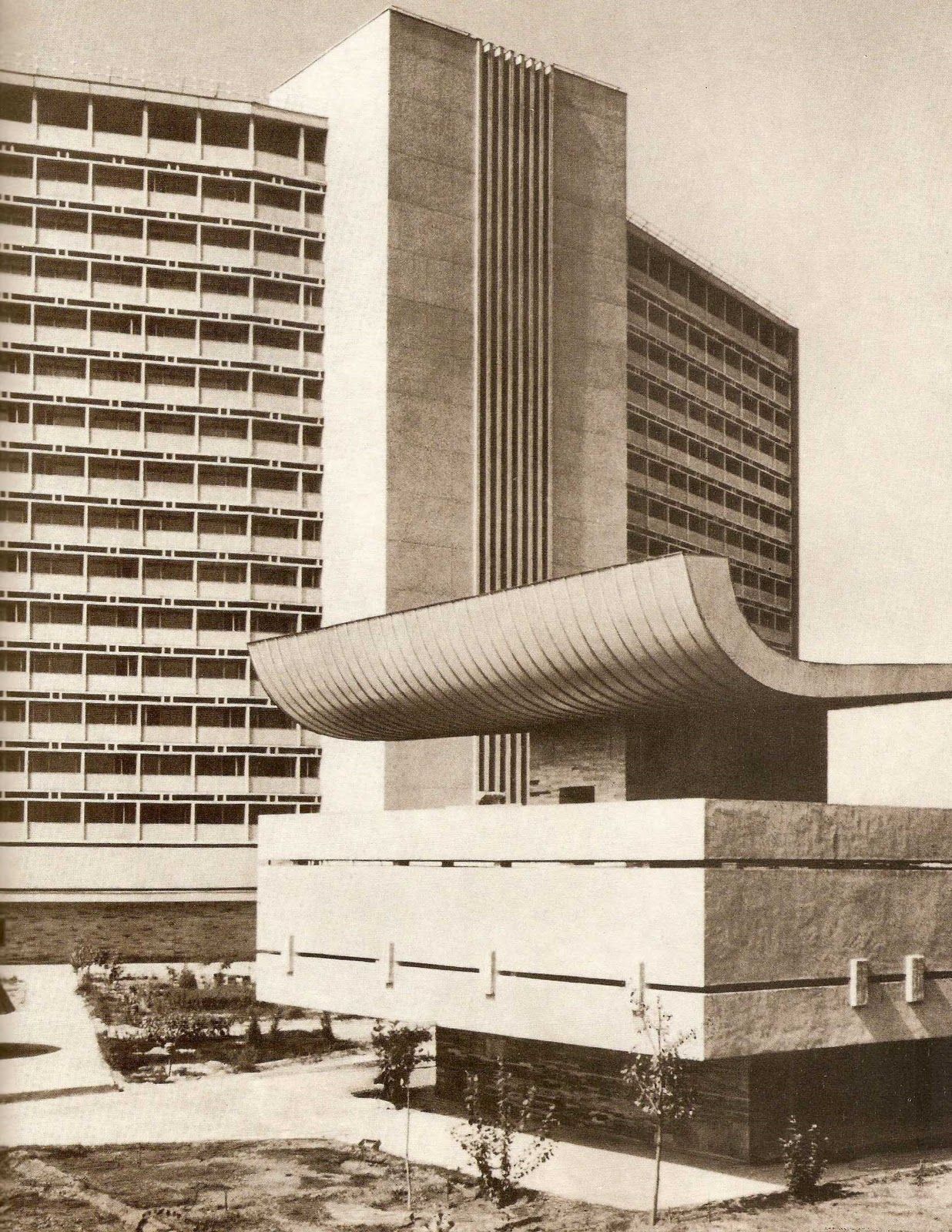 Фасад с одной стороны был открытым, с другой стороны — декоративные теневые решетки. Во дворе размещался интересный фонтан с керамическими кувшинами и мозаикой. Вроде бы и интернациональный модернизм, но есть в нем и что‑то национальное. Архитектура получилась в плане с изломом, потому что здание стояло на горе в сейсмической зоне, и этот излом надо было как‑то подчеркнуть. Сносили его долго (в 2004 году гостиница была упразднена и демонтирована до первого этажа. — Прим. ред.) и никак не могли снести. Сегодня на горе устроена парковка.