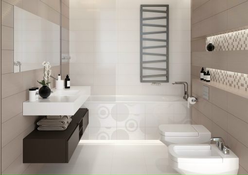 - В совмещенном санузле, за счет различной кладки, можно выделить нужный участок, нишу или создать акцент с определенными зонами, например, с умывальником, унитазом, душем, полотенцесушителем. При использовании облицовки в более темных тонах, выделенная часть, иллюзорно становится ближе.