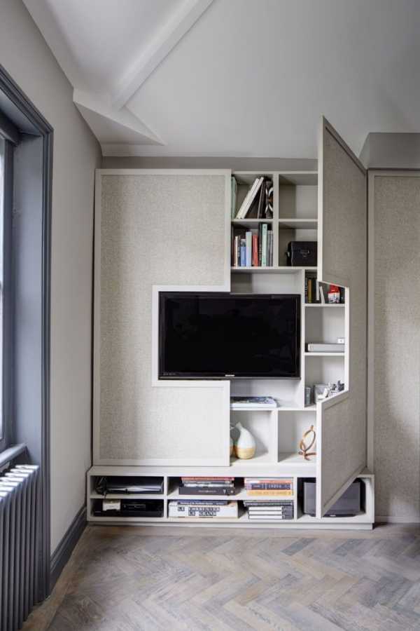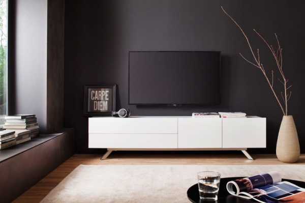 Под телевизором можно разместить навесную панель со встроенным отсеком для проводки, с закрывающейся дверцей. Неплохо под экраном будет смотреться банкетка. Но наиболее распространенным способом спрятать шнур, идущий от телевизора – разместить под ним практичную мебель: тумбу или пенал. Достаточно ее поставить в зоне телевизора и вся проводка будет расположена за шкафами или полками на стене.