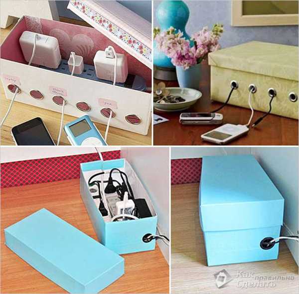 Часто нам мешают провода от различных зарядных устройств. В таком случае можно сделать так, как на фото – спрятать их в специально сделанной для этого коробке. Если вы можете предложить свой метод, то в конце статьи можно добавить комментарий и прикрепить к нему фото вашего изобретения.