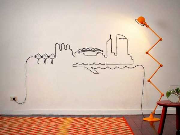 Если у вас есть художественный вкус, то можно закрепить провод на стене, сделав из него картину. Вполне понятно, что родного, полутораметрового провода для этих целей не хватит. Выберите подходящий рисунок, и перенесите его контуры на стену, сделав нежирный рисунок простым карандашом. Теперь нужно высчитать требуемое количество провода. Для этого можно приложить к стене капроновую нить, так чтобы она повторяла рисунок. Потом ее расстояние можно измерить. Не забудьте прибавить длину от рисунка до розетки и до источника потребления электричества – добавьте метр про запас, и вы получите искомое количество.