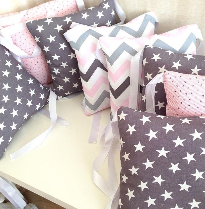 - Подушки-бортики в детскую кроватку. Такой вариант состоит из нескольких подушек, которые можно завязать на прутья кровати с помощью завязок или прикрепить липучками.