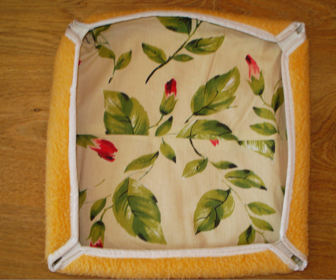 Теперь нужно вырезать квадрат ткани, которая повторяла бы своим узором и оттенком доминирующую расцветку верхней части чехла. Размер куска ткани должен быть немного больше нашего изделия. Укладываем на стол вырезанный материал, сверху кладем чехол, лицевой стороной вверх.