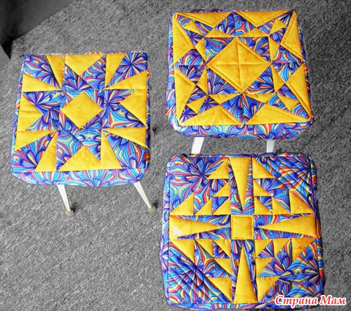 Выкраиваем из ярких лоскутов 32 больших квадрата размерами 12,5х12,5 см (верх чехла) и 32 малых квадрата из плотного ситца величиной 9,5х9,5 см (низ чехла). Есть и другие способы, как пошить чехол на табурет в технике бисквит, когда верхние квадраты пришиваются напрямую к сплошной нижней подкладке. Каждый метод имеет свои плюсы. Однако, продолжим.