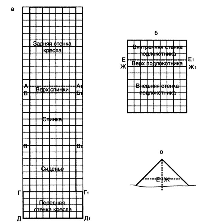 Одна ее боковая сторона заходит на внутреннюю часть спинки на 18 см, другая – на переднюю часть подлокотника. Нижний край заготовки помещаем на сиденье.