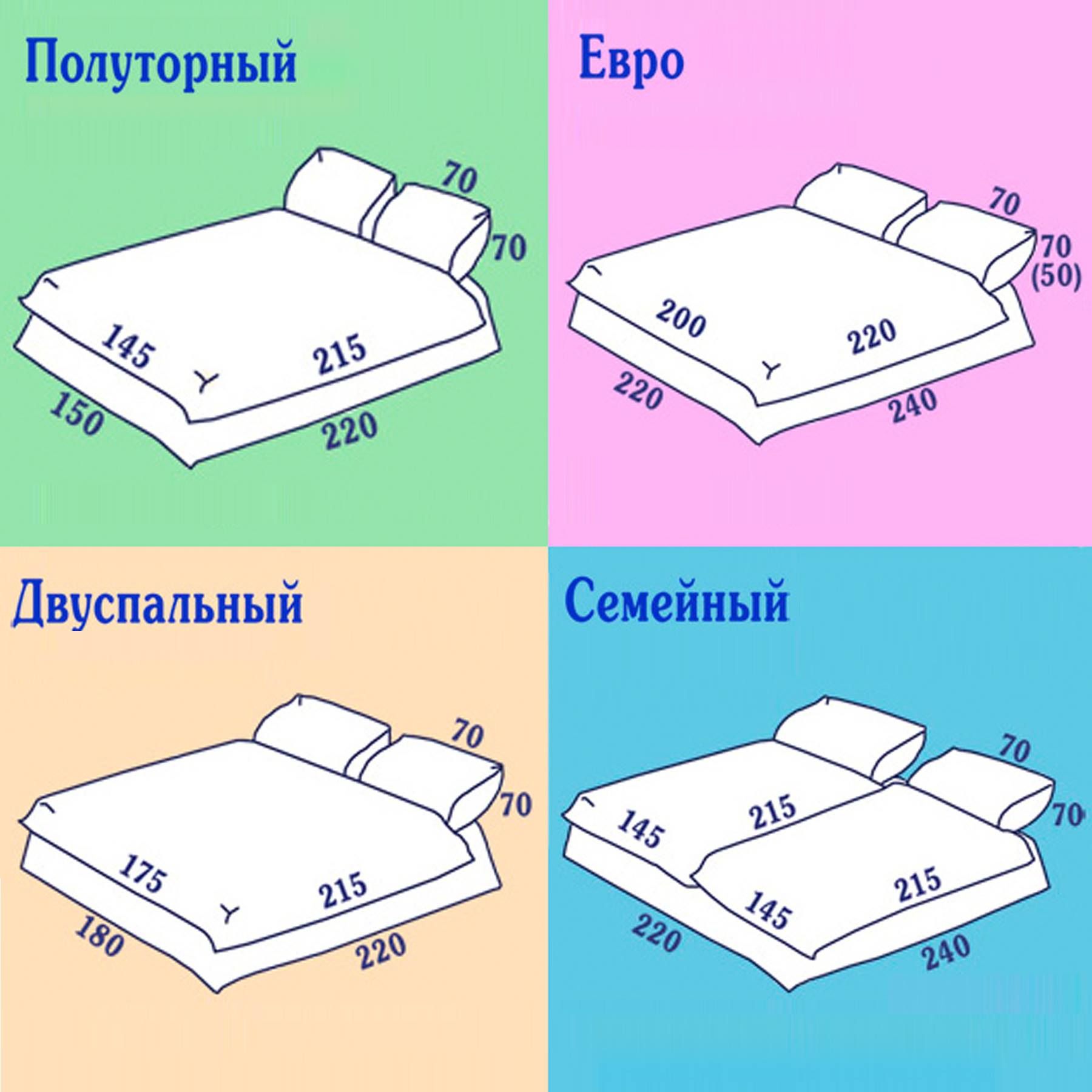 | Двуспальный (Евро стандарт) | от 200х220 см до 215х220 см | от 200х215 см | 50х70 см 60х60 см 70х70 см 75х75 см |