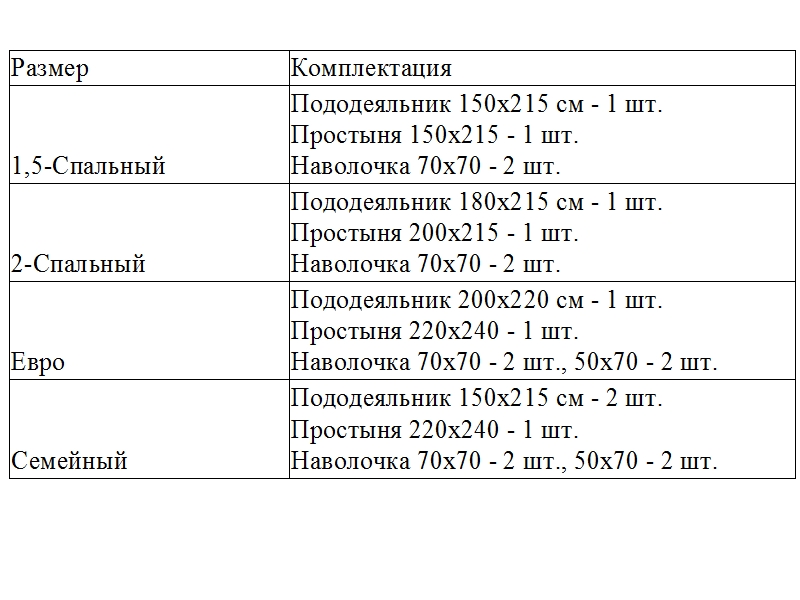 | Размер комплекта | Пододеяльник | Простыня | Наволочки |