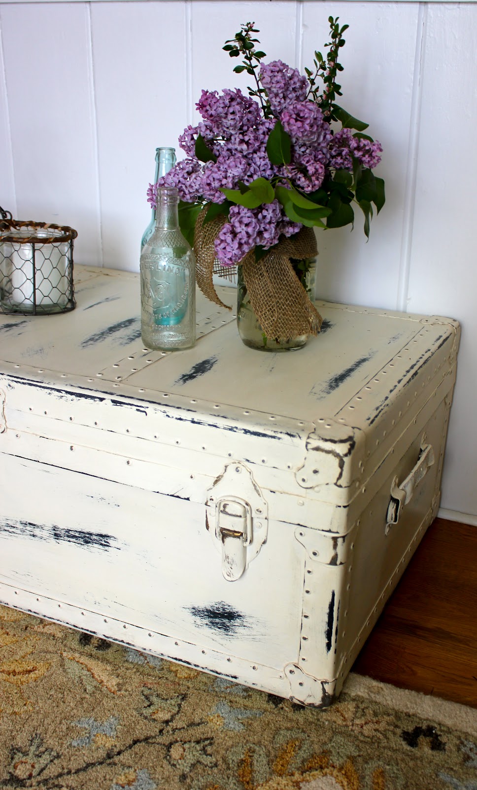 Старую краску можно удалить наждачной бумагой, нанести несколько слоев новой краски и покрыть крем-воском. Внутренность чемодана зачистить, нанести клей и приклеить ткань, края декорировать тесьмой. А дальше вступает в работу ваша фантазия.