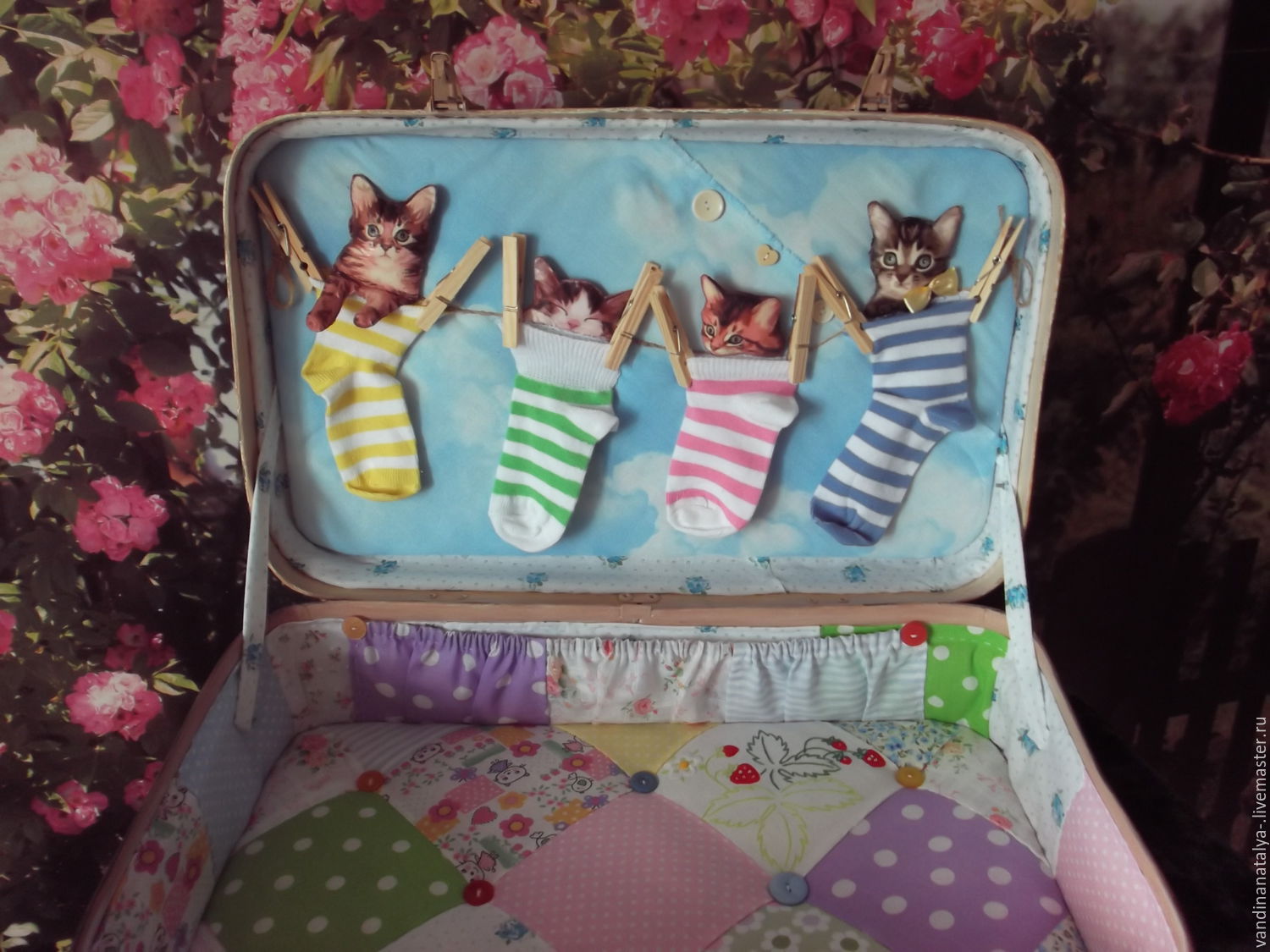И теперь наш преобразившийся фамильный динозавр наполнился новым содержимым и отправился жить в новую, сиреневую комнату моей дочери. А я, наконец, вздохнула свободно, ибо возрождение чемодана — дело выматывающее. Хотя и интересное))