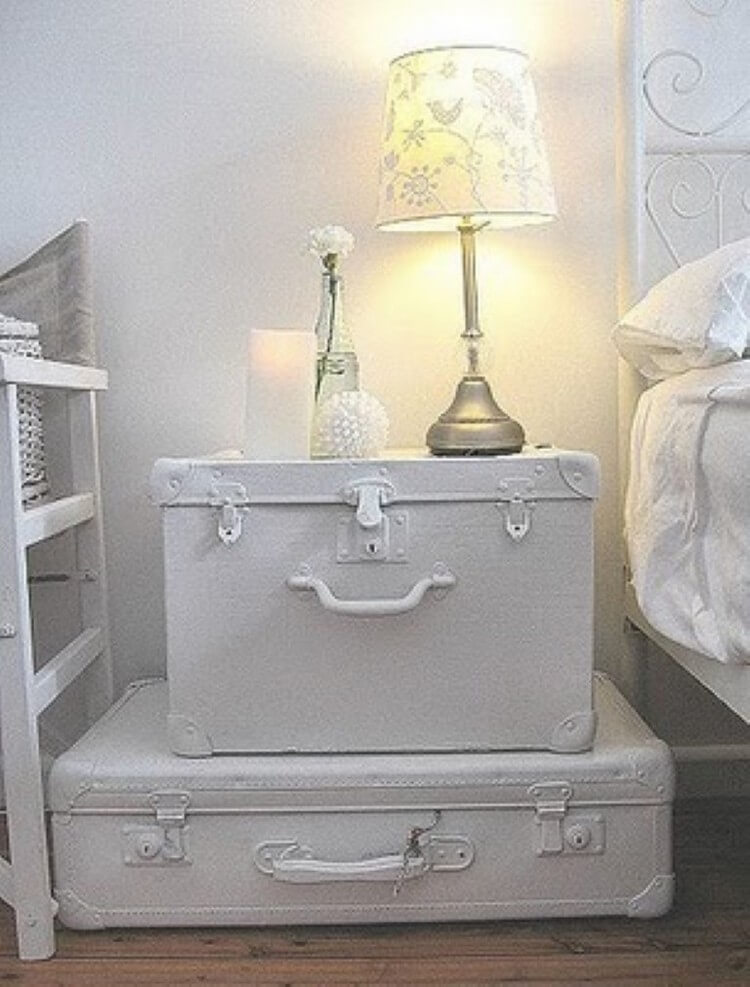 Сложите несколько чемоданов друг на друга и получите прикроватный столик, важно помнить, чтобы верхний чемодан имел жесткую поверхность, ведь на него поставите настольную лампу, часы, положите книгу.