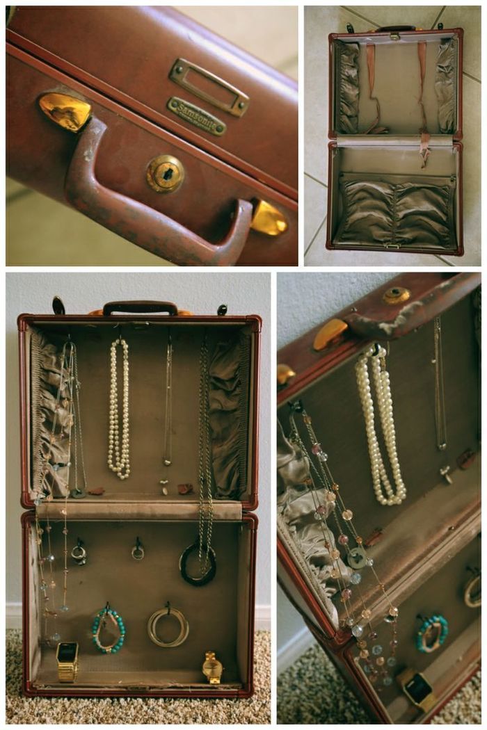 Если нижнюю часть разделить картоном на небольшие отсеки, то в данном случае чемодан может служить для хранения мелочей и бижутерии. Нижнюю часть приспособить под бусы, а серьги разместить на верхней части.