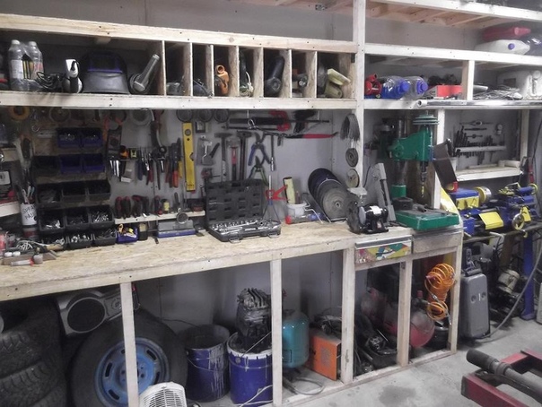 Удобен и практичен в использовании в гаражном пространстве стеллаж для шин. Отличные экземпляры можно отыскать в магазинах, но некоторые умельцы сами собирают подобную конструкцию, отдельно приобретая металлические расходники: уголок или же профиль. Нелишними будут полки и панели для инструментов, которые можно купить или сделать самому.